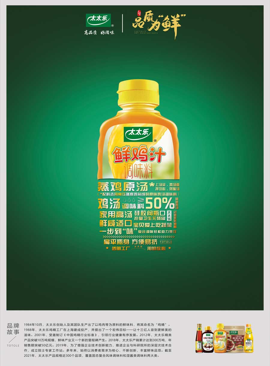 上海太太樂食品有限公司創立于1988年,中國雞精、雞粉行業標準制定單位之一,并于1999年加入世界知名的食品飲料公司瑞士雀巢,充分利用國際資源加速產品和技術研發。秉承“太太樂,讓生活更美好”的企業愿景,太太樂一直致力于鮮味科學的研究和推廣,帶動鮮味產業的技術創新,不斷為消費者帶來健康又美味的新一代調味品。