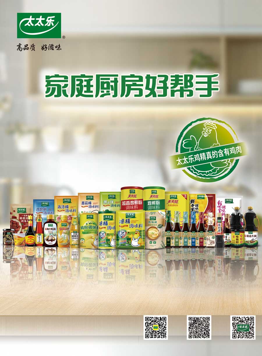 太太樂產品覆蓋固態復合風味調味料和液態增鮮調味料兩大類的不同系列,多個子品牌,產品規格近300個品項。太太樂憑借雀巢體系的國際化管理體制、全球化質量監管體系、強大的研發實力和卓越的員工團隊,依托以餐飲、零售、電商、出口為主的四大銷售渠道,銷售網絡覆蓋全國各地,并出口至美國、加拿大、日本、中東等國家和地區。作為鮮味科學倡導者,太太樂以“讓十三億人嘗到更鮮美的滋味”為企業使命,持續鮮味行業革新升級。