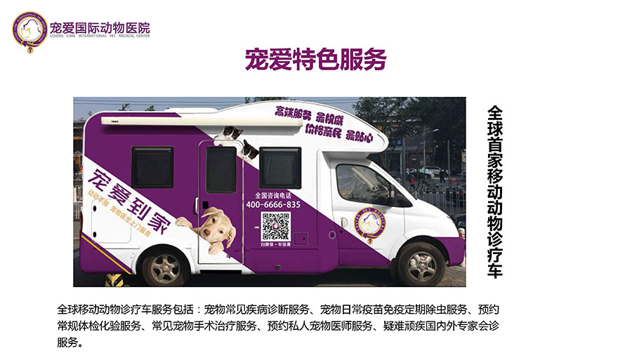 2016年為滿足用戶多元化需求,便捷客戶診療服務,寵愛國際推出動物醫療車,提供上門醫療服務。