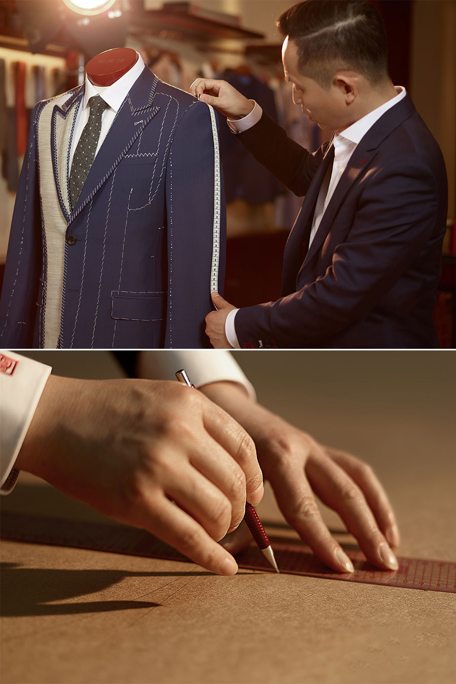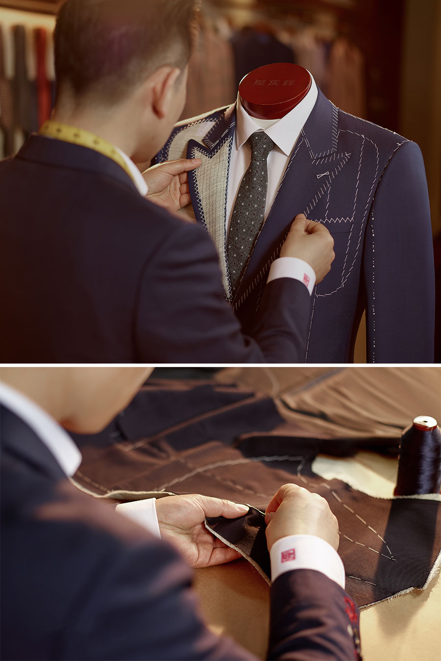 隆慶祥以量身定制為核心特色,提供從面料選擇、款式設(shè)計到工藝優(yōu)化、售后服務(wù)的全程服務(wù),產(chǎn)品均為“單人單版、單版單裁、單裁單做”,以獨一無二的專屬性彰顯尊貴榮耀。每套西裝定面料、定款式、制版、裁剪、制作、試樣、后道整理、取件共八道工序,均采用406道工序,而且大量工序是手工制作。產(chǎn)品均“單人單版、單版單裁、單裁單做”,以獨一無二的專屬性彰顯尊貴榮耀。