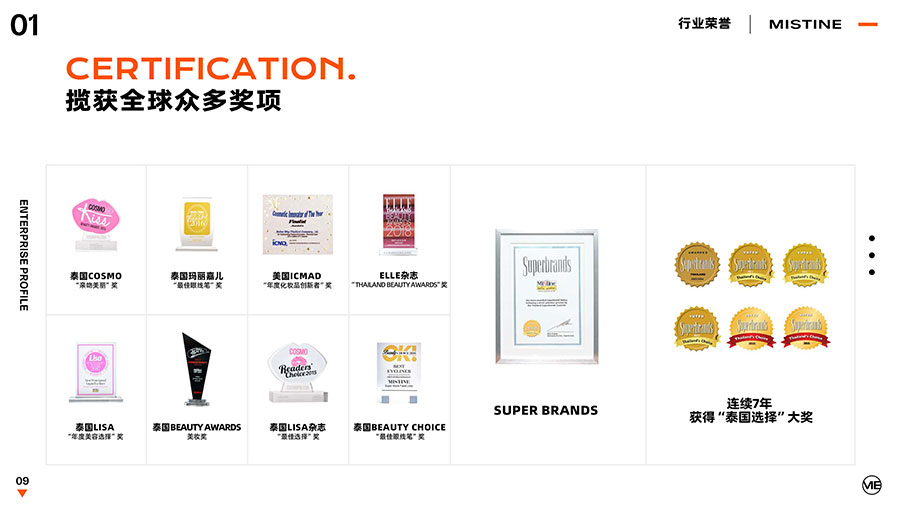 36年來,MISTINE蜜絲婷步履不停,堅持從消費者出發,以優質專研產品、適時而動的渠道策略和持續發力的品牌塑造,贏得眾多消費者的喜愛和行業內外的贊許。迄今,MISTINE蜜絲婷已連續七年攬獲“泰國選擇”大獎,同時先后榮獲中國化妝品大會藍玫獎「2022年度競爭力品牌」、IQF國際品質節暨消費領導力峰會「杰出消費影響力品牌」、CAQI中國質量網「全國美妝行業質量領先品牌」、天貓金妝獎超級單品「年度防曬獎」、凱度消費者指數「極具成長力品牌」等榮譽。