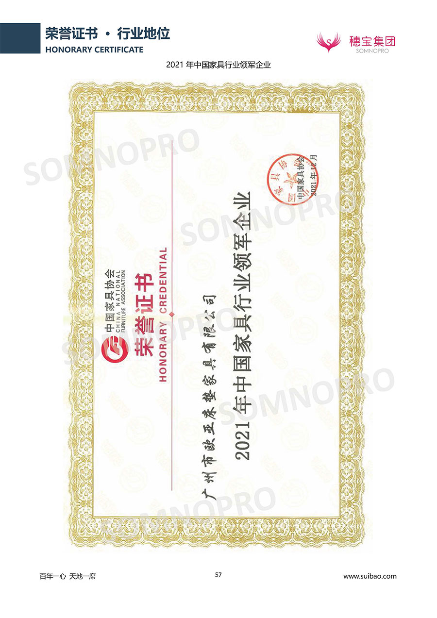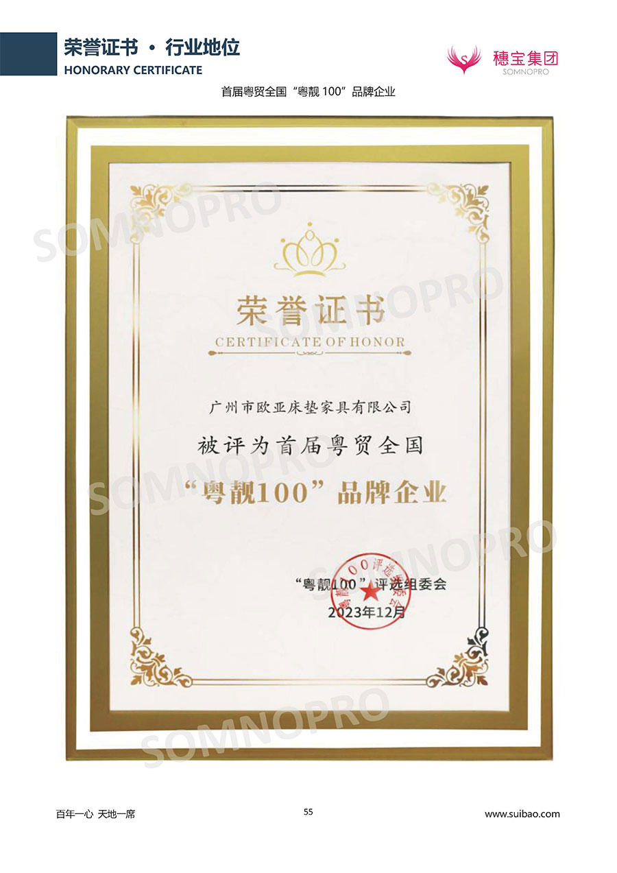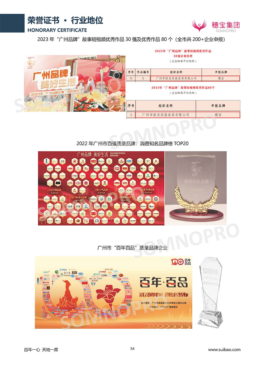 自1971年獨立研發生產出專屬國人的彈簧床墊,穗寶關于優質深度睡眠的研究已有半個世紀的歷史。穗寶一直專注床墊,專注中國消費者的睡眠研究,針對中國人特點進行優化創新,不斷提升國人的睡眠體驗,只為成就每個晚上8小時的優質深度睡眠。憑借不斷革新的研發科技和深受消費者信賴的產品品質,穗寶集團旗下品牌和產品屢獲國內外大獎,連續20年榮膺中國500最具價值品牌,品牌價值高達302.89億元。