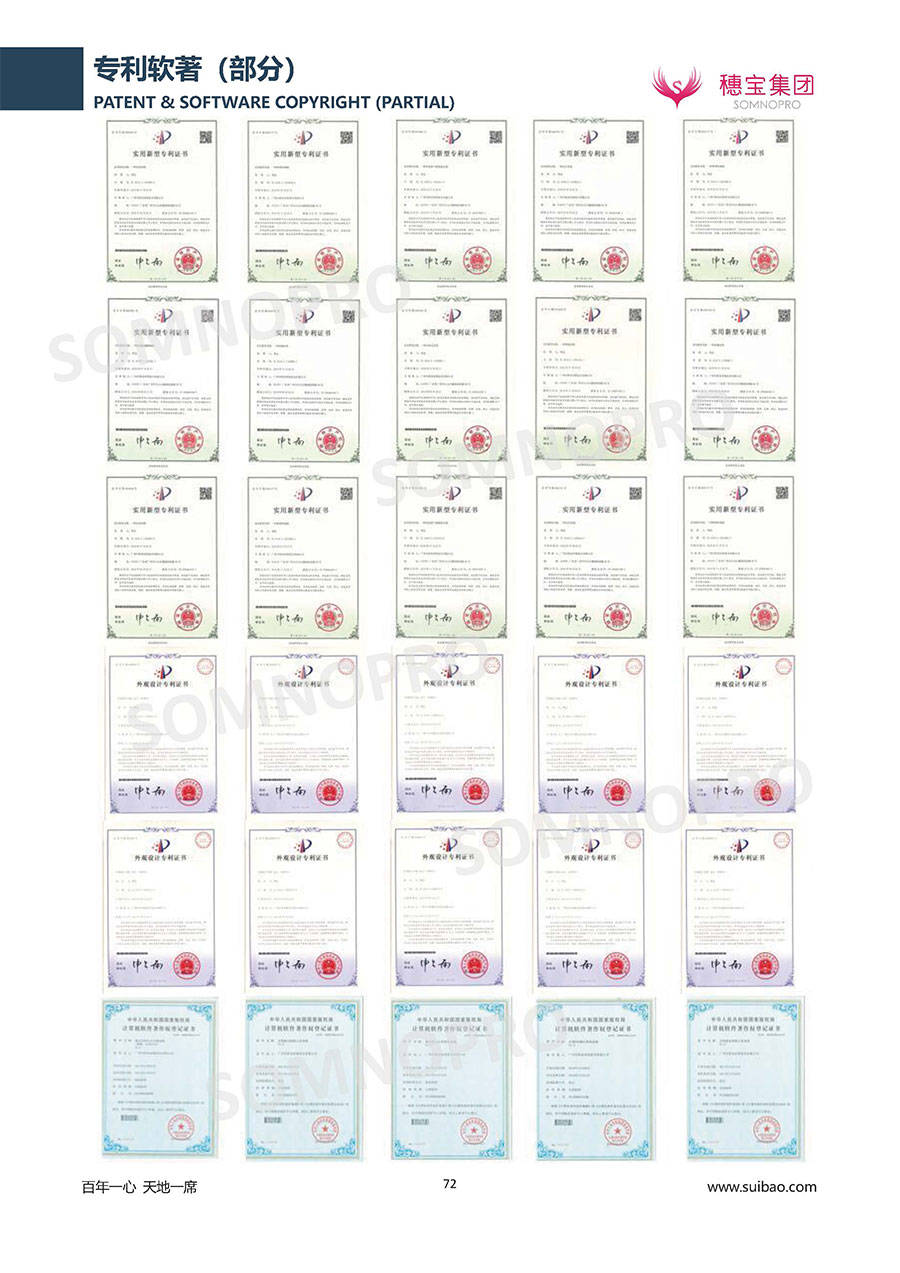 穗寶遍訪全球,深度整合世界優質資源,專注睡眠研究,與世界家具材料行業領導者禮恩派集團結成戰略伙伴,成立睡眠研究中心和彈簧網檢測中心,引入床墊鋪面耐久性測試儀,材料拉力測試儀,床墊撓度曲線測試儀,為產品注入優秀基因;成功研發推出IFEEL深睡感知系統、X7研發系統,關注消費者每一個細微的睡眠需求,致力于以科學的方式創造優異的物理與心理助眠條件,幫助現代人獲得優質深度睡眠;不斷創新進取,軀位步技術、T-GUARD衡力支承系統等多項成果獲國內國際專利。