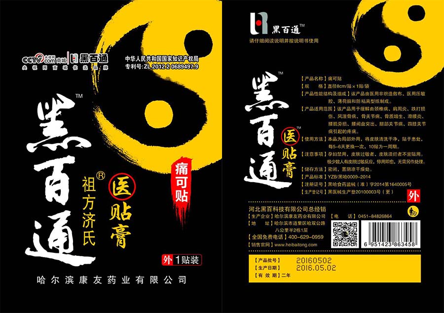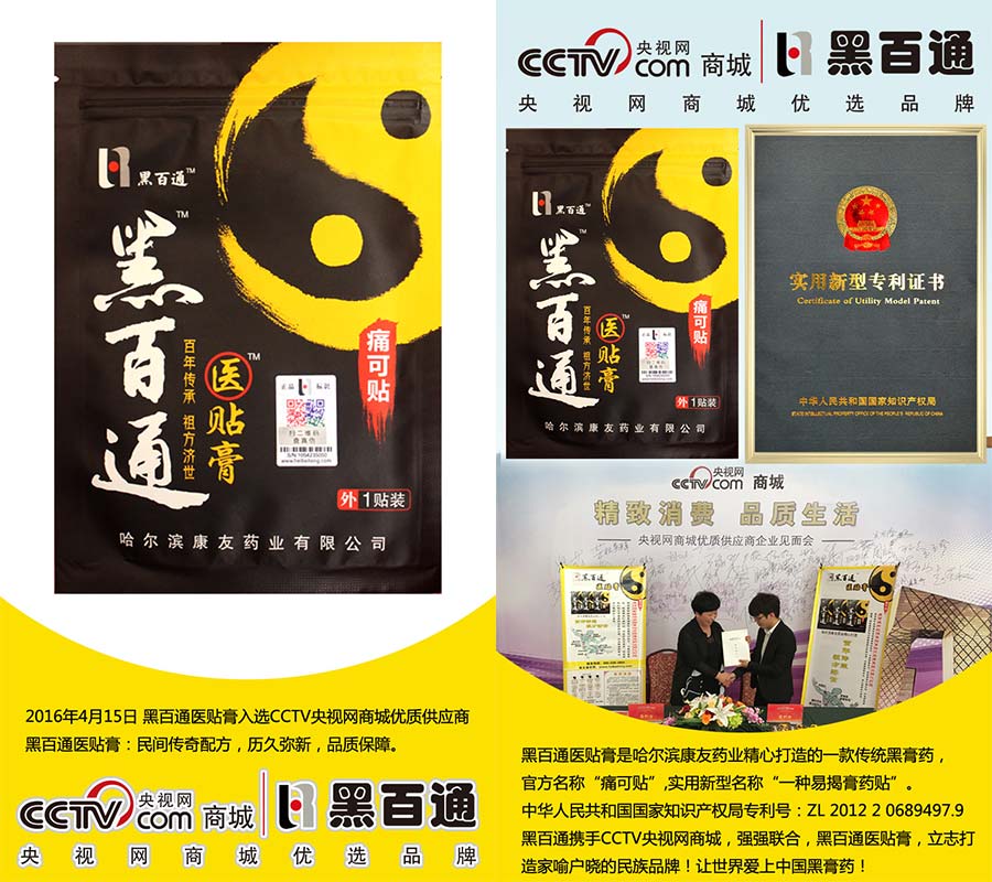 黑百通醫貼膏是哈爾濱康友藥業鼎力打造的一款傳統黑膏藥官方名字叫“痛可貼”
