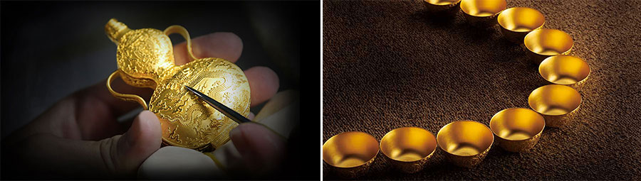 國金黃金自涉足藝術黃金領域之初就努力踐行“非凡技藝、完美品質”的產品理念,以客戶體驗為中心圍繞傳承和使用理念設計和策劃產品。逐步建成了以傳家系列、平安系列、婚慶系列、生肖系列及國金定制五大系列組成的產品細分體系。其中,從文化層面包含了酒文化、茶文化、福文化、佛文化、喜文化、生肖文化、節慶文化、紀念文化等題材;從功能上又包含了食器、酒器、茶器、福器、玩器、合器等實用器型,能滿足各類客戶的多元化需求。此外,擁有眾多專業設計人才的國金定制顧問團隊,又能為個人客戶和企業客戶提供一對一的專業定制服務,幫助每一位客戶實現黃金夢想,造就品質生活。