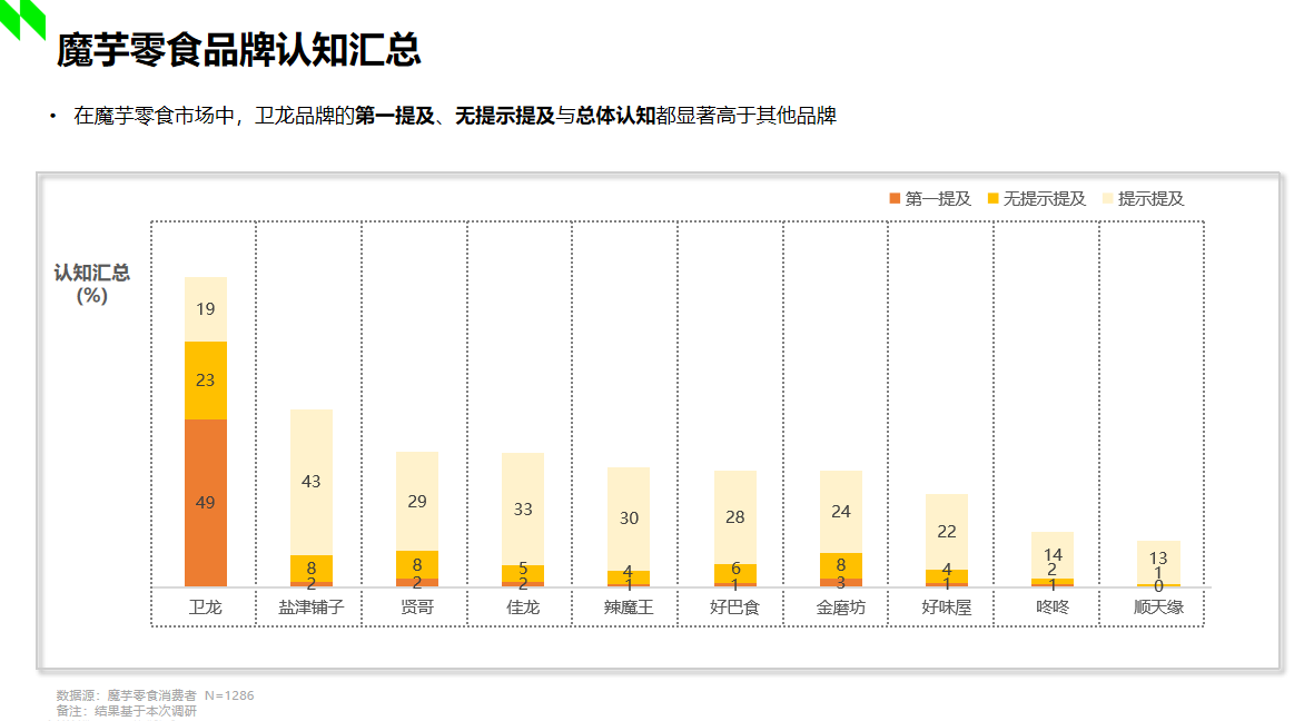 據(jù)2022年尼爾森調(diào)研顯示,在魔芋市場(chǎng)中,衛(wèi)龍品牌的第一提及、無(wú)提示提及與總體認(rèn)知都顯著高于其他品牌。顯然,衛(wèi)龍發(fā)明的魔芋爽在市場(chǎng)中已然奠定了良好且堅(jiān)固的受眾認(rèn)知基礎(chǔ),那么“小魔女”的加入,不僅進(jìn)一步充實(shí)了衛(wèi)龍自身的產(chǎn)品矩陣,占位了“魔芋素毛肚”的產(chǎn)品類目,也將引領(lǐng)魔芋休閑食品賽道邁向更高品質(zhì)的發(fā)展方向,為市場(chǎng)打開全新的增量機(jī)遇。