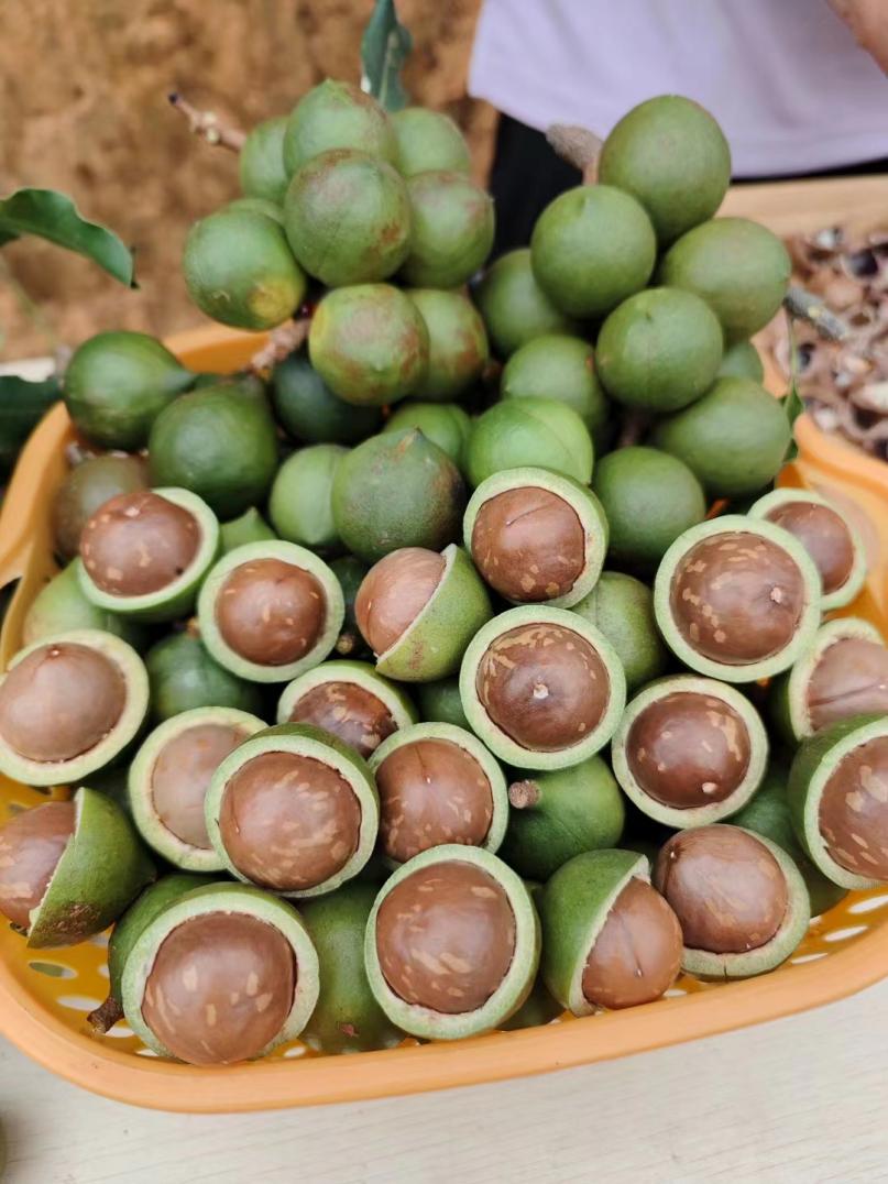 樹上,一串串咖啡色的堅果掛滿枝,陣陣飄香;樹下,果農來回穿梭采摘忙。