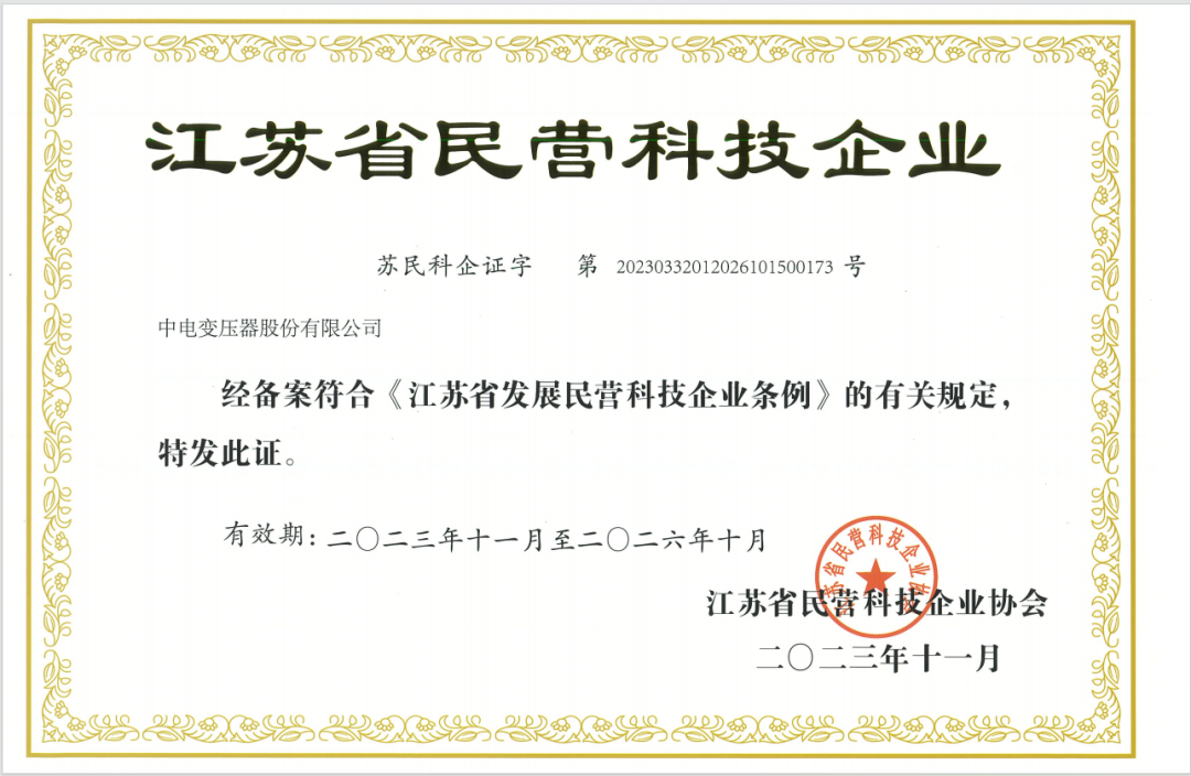 中電變壓器榮獲“江蘇省民營科技企業”稱號