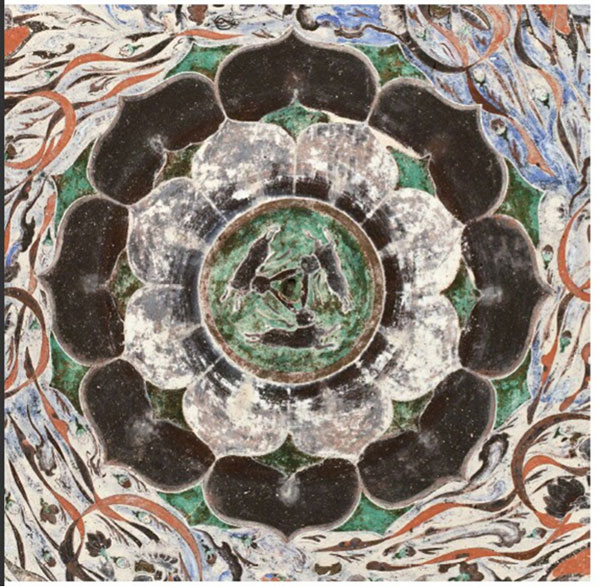 「三兔共耳」源于敦煌石窟第407窟頂中央藻井的“三兔聯跑蓮花紋”。在這個開鑿于隋代的洞窟中,窟頂中央繪制了數層八瓣大蓮花;周遭環繞著衣帶飄飄、手持花盤的飛天形象;蓮花中心則繪制了三只追逐奔跑的兔子。畫師以巧思將每只兔子二只耳朵中的一只重疊,看似三兔三耳,但以每只兔子各自的角度觀察,則雙耳俱全。三只兔耳組成等邊三角形,配合外圍的蓮瓣與飛天,不僅兔子奔跑跳躍的神態生動逼真,整個藻井紋飾也都充滿了動感!