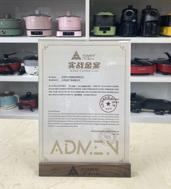 2022年第十一屆ADMEN國(guó)際大獎(jiǎng)8月16日在天津揭曉并頒獎(jiǎng),北京利仁科技股份有限公司選送的《“利仁電器”》央視案例榮獲整合營(yíng)銷(xiāo)類實(shí)戰(zhàn)金案獎(jiǎng)。