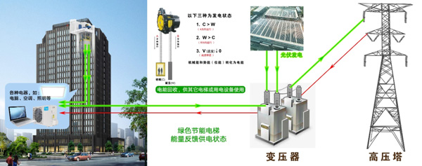 愛登堡自主研發的集成四象限變頻器,利用上升和下降的不平衡重量將勢能轉化為動能和電能發電,給樓宇的用電設備使用、減少樓宇設備向外界獲取的電能。愛登堡綠色電梯節能減碳技術,降低產品能耗,減少環境污染,推動社會綠色低碳發展,為實現碳達峰碳中和做出一份貢獻。