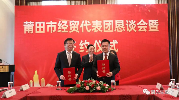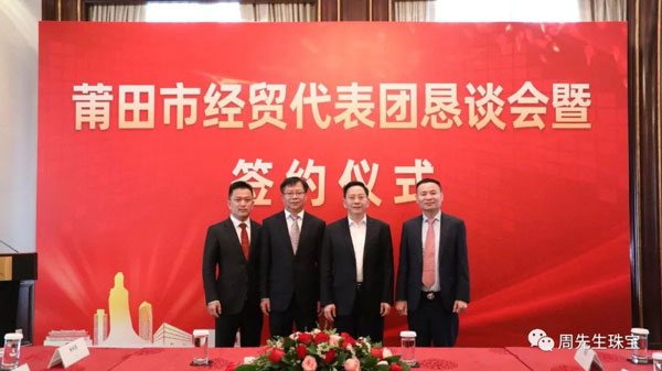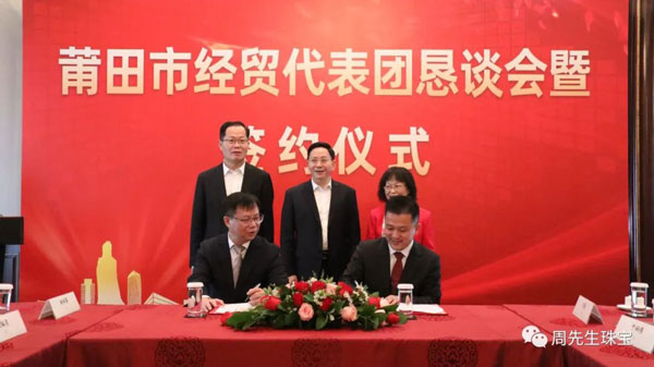 懇談會期間,莆田經貿代表團與眾多莆仙籍企業家面對面交流,就共同推進項目合作達成諸多意向,舉行了簽約儀式。香港周先生珠寶金行國際集團有限公司作為應邀出席的企業之一,在眾多領導的見證下簽署“香港周先生珠寶金行國際集團有限公司供應鏈平臺”項目合作協議 。