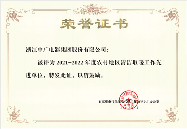 日前,浙江中廣電器集團股份有限公司榮獲由石家莊市氣代煤電代煤工作領導小組辦公室授予的“2021-2022年度農村地區清潔取暖工作先進單位”榮譽稱號,以此表彰以中廣電器集團在當地農村地區清潔取暖工作中所作出的杰出貢獻。