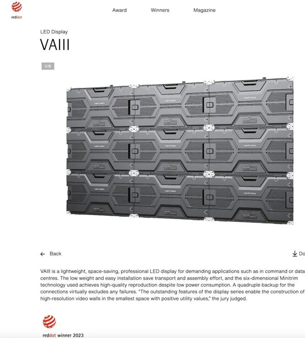 近日,2023年德國紅點設計大獎名單公布。聯建光電VAIII系列微間距顯示屏、Pilot Pro系列租賃顯示屏、BIM Plus-X系列室內商業顯示屏三款產品同時斬獲素有設計界“奧斯卡”之稱的紅點設計獎,這三款產品凝聚著全球前沿技術和創新設計,實至名歸。據統計,聯建光電是2023紅點獎中獲獎最多的LED顯示品牌。