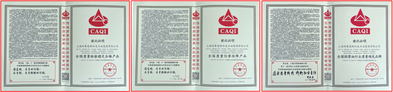 迎接即將到來的又一個(gè)全國質(zhì)量月——9月之際,8月11日,中國質(zhì)量協(xié)會(huì)向上海柯賽德斯加美石油集團(tuán)有限公司頒發(fā)三大榮譽(yù),即全國質(zhì)量檢驗(yàn)穩(wěn)定合格產(chǎn)品、全國質(zhì)量信譽(yù)保障產(chǎn)品、全國潤滑油行業(yè)質(zhì)量領(lǐng)先品牌。這是在新的市場形勢下,柯賽德斯加美石油集團(tuán)深耕能源,堅(jiān)持質(zhì)量振興企業(yè)、科技助推發(fā)展、誠信塑造品牌戰(zhàn)略的長期努力結(jié)出的碩果。