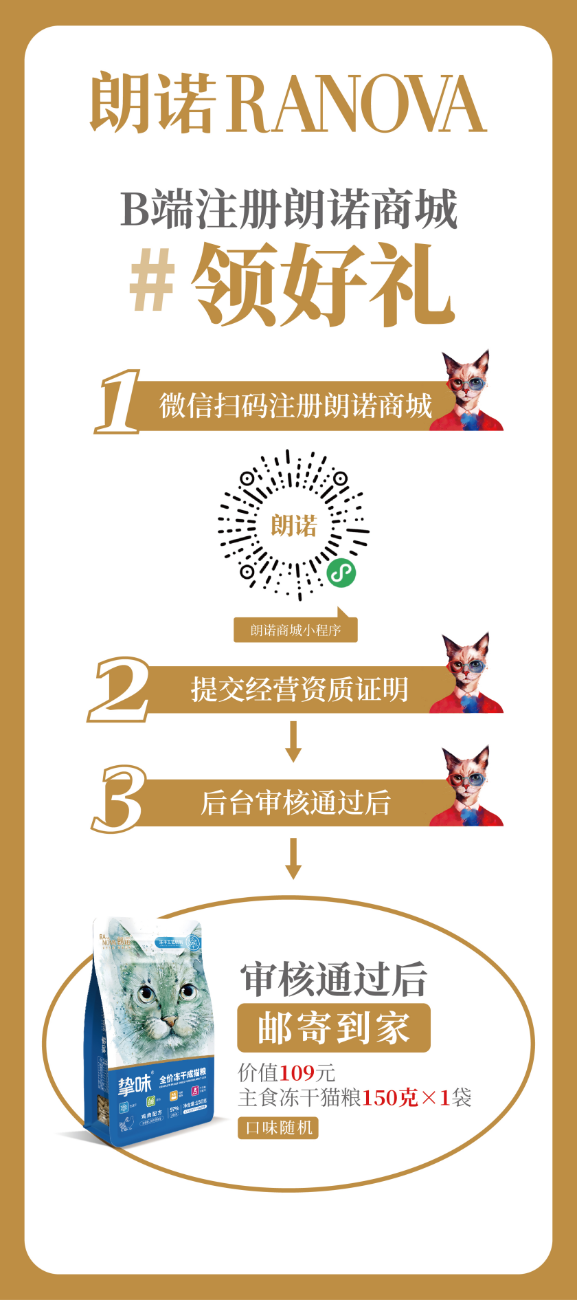 朗諾誠邀各位B端客戶,微信掃碼注冊“朗諾商城”或者微信搜索“朗諾商城”,按步驟上傳資質,審核通過,即可獲得朗諾準備的精品好禮一份:朗諾主食凍干150克(口味隨機)一袋,直接包郵到家。同時我們還為“朗諾商城”的各位客戶,定制超值價格政策,進貨不費力,敬請期待。
