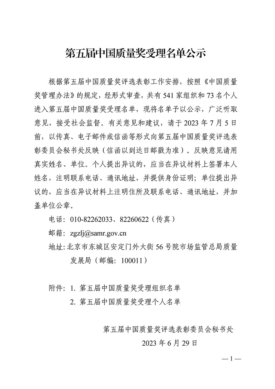 據悉,有關意見和建議可于 2023 年 7 月 5 日前,以傳真、電子郵件或信函等形式向第五屆中國質量獎評選表彰委員會秘書處反映(信函以到達日郵戳為準)。反映意見應當用真實姓名、單位。個人提出異議的,應當在異議材料上簽署本人姓名,注明聯系電話、通訊地址,并提供身份證明;單位提出異 議的,應當在異議材料上注明住所及聯系電話、通訊地址,并加蓋單位公章。