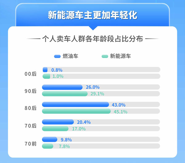 據(jù)天天拍車數(shù)據(jù)顯示,個人賣車車主年齡段分布占比,新能源車車主80后占比45.1%,90后占比29.1%,00后占比1.0%,對應燃油車車主占比分別為43.0%,26.0%,0.8%。在越來越成熟的新能源汽車技術(shù)和促消費政策的加持下,新能源汽車保有量不斷增加,確保了二手車市場交易中新能源二手車車源充足,不少消費者在兼顧嘗“新”和性價比的心態(tài)下,選擇消費新能源二手車,不失為一個比較理性的消費心理。