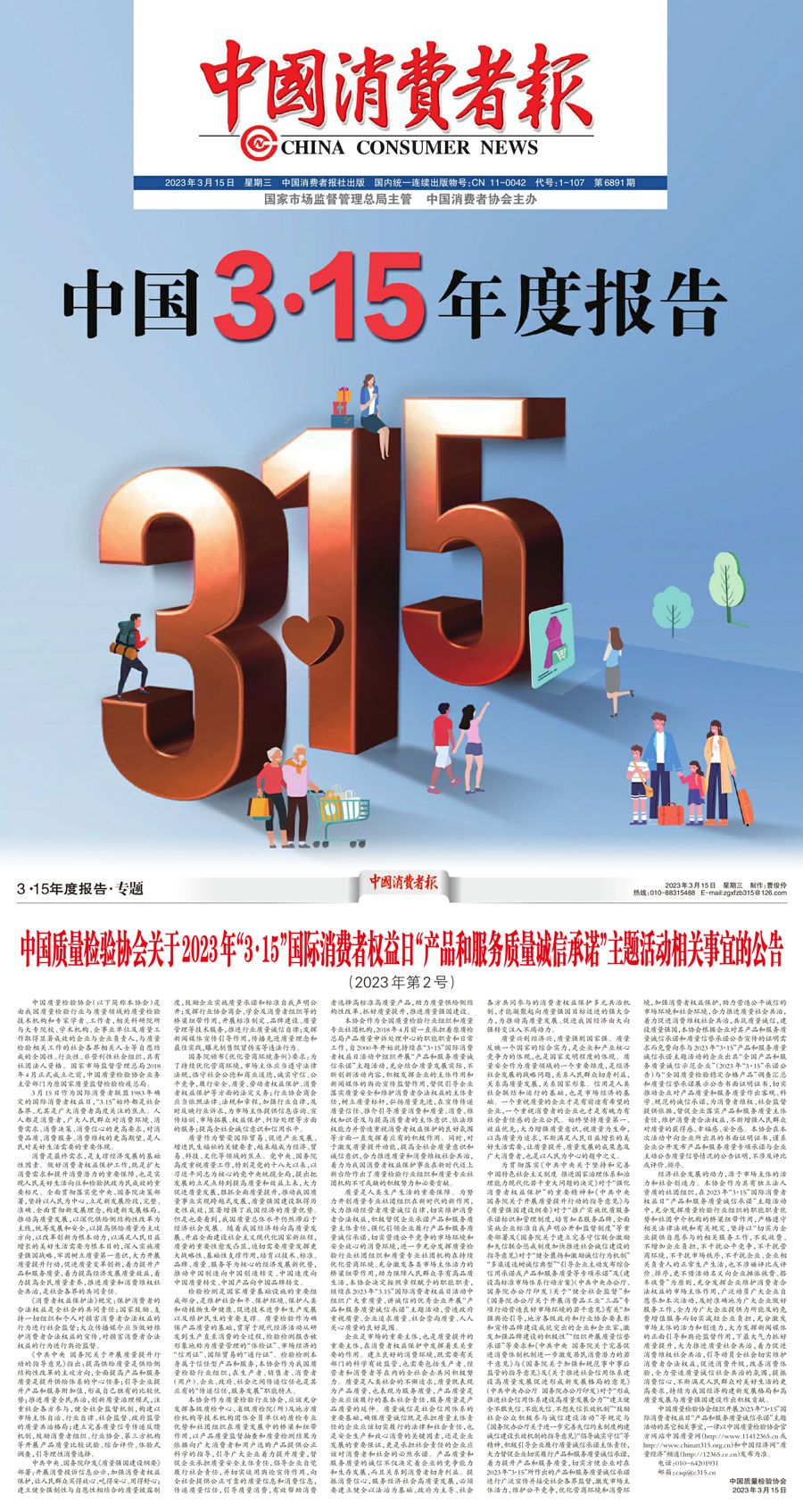 中國消費者報:中國質量檢驗協會關于2023年“3·15”國際消費者權益日“產品和服務質量誠信承諾”主題活動相關事宜的公告