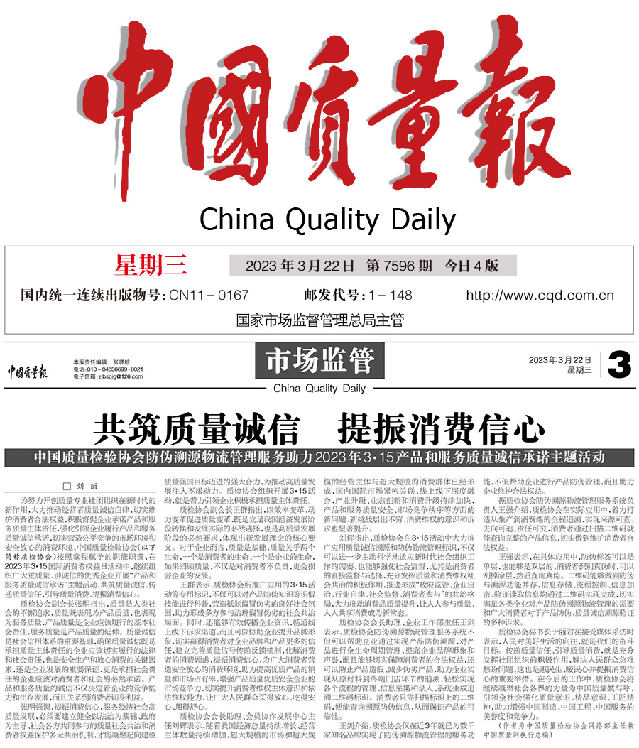 中國質量報:共筑質量誠信 提振消費信心——中國質量檢驗協會防偽溯源物流管理服務助力2023年3·15產品和服務質量誠信承諾主題活動