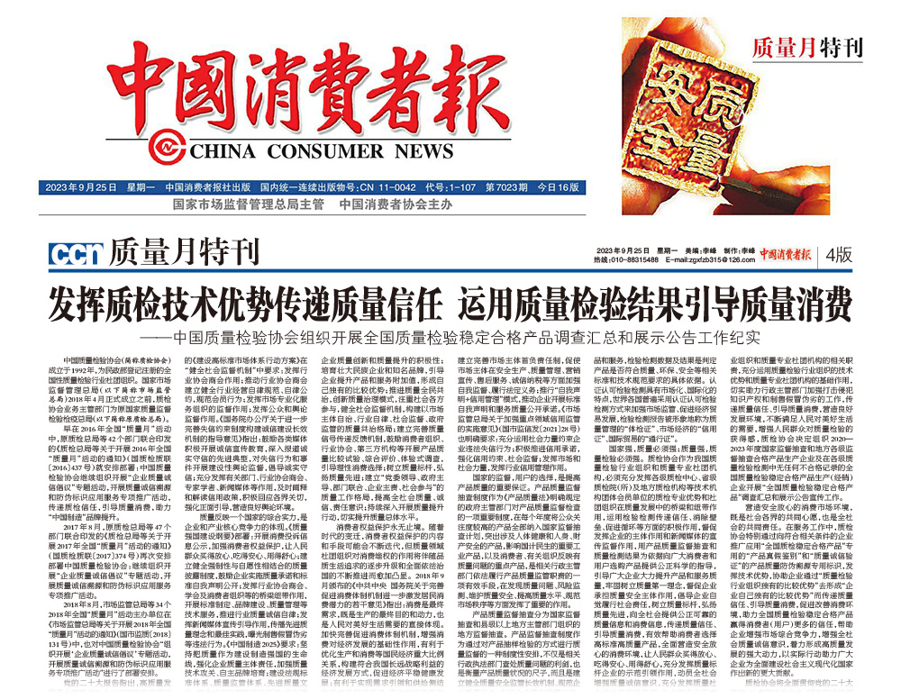 中國消費者報——發揮質檢技術優勢傳遞質量信任 運用質量檢驗結果引導質量消費——中國質量檢驗協會組織開展全國質量檢驗穩定合格產品調查匯總和展示公告工作紀實