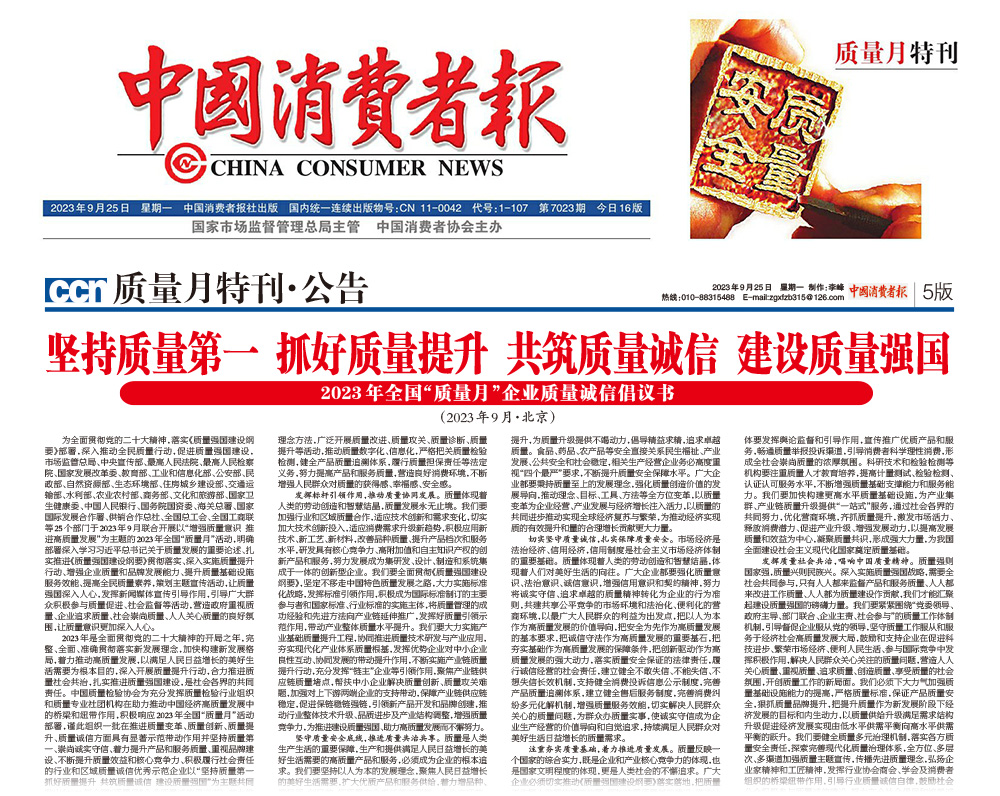 中國消費者報——堅持質量第一 抓好質量提升 共筑質量誠信 建設質量強國——2023年全國“質量月”企業質量誠信倡議書