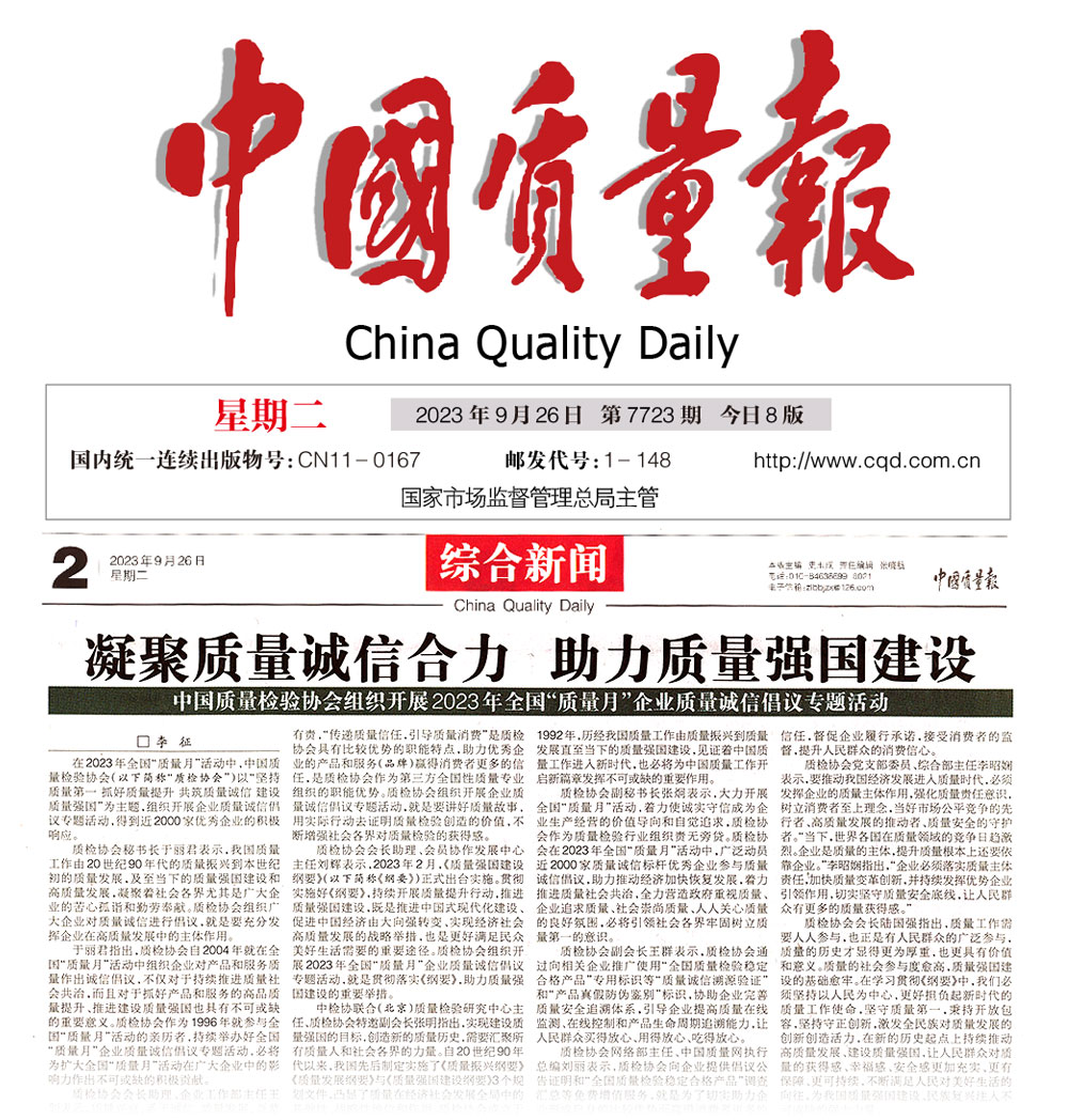 中國質量報——凝聚質量誠信合力 助力質量強國建設——中國質量檢驗協會組織開展2023年全國“質量月”企業質量誠信倡議專題活動